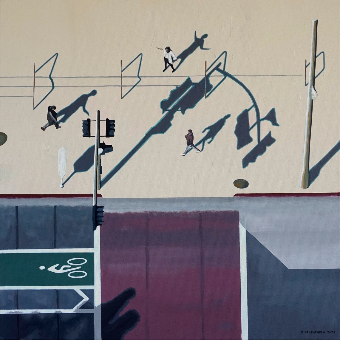 Brisbane artist J Valenzuela Didi draws on the emergence of patterns and geometric shapes to explore common scenes and signposts of modern life.  In his paintings, familiar urban landscapes become haunting and alien reminders of the beauty and character of the present-day.