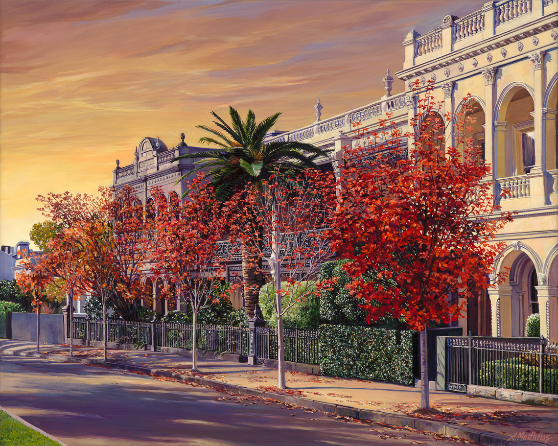 "After visiting ‘The Johnston Collection’ Museum (in a secret location) in East Melbourne, I wandered onto autumn, tree lined Streets. Enoying long afternoon shadows and trees dressed in red, the stucco glowed in afternoon light. Canterbury Terrace, a group of 16, 1877 residences in Powlett Street in Italianate style marries beautifully with the red leaves and Canary Palm. So majestic. I feel fortunate to have visited when I did. Another couple of weeks and all the leaves would have fallen and trees would be bare." Alexandra Matthews