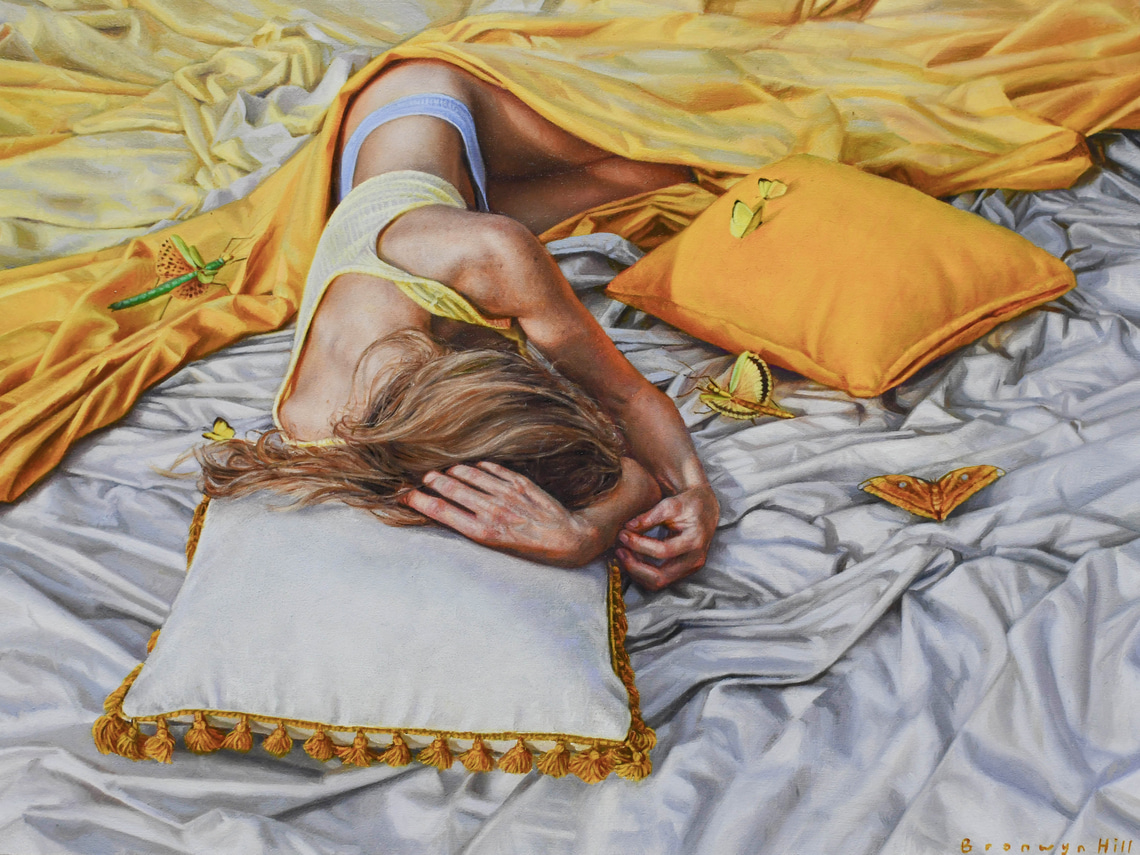 Bronwyn Hill is a Brisbane based painter whose practice predominantly focuses on portraiture and figurative representation. Recognized for her sensual photo-real oil paintings, full of poetic narratives and gentle observation, her work often exploring ideas of self-analysis and introspection within moments of personal solitude. Imbued with a sense of stillness and contemplation, Hill’s use of light and shadow and its emotional impact is a recurring feature of her images, as is her subtle use of colour and exquisite depiction of natural forms.