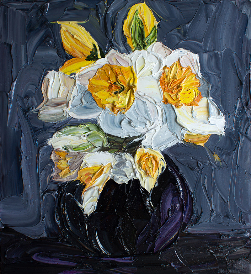 Jodie captures her images in minimal broad strokes of paint, spread with a palette knife. Her richly textured style combined with a dramatic colour palette creates vivid interpretations of nature.