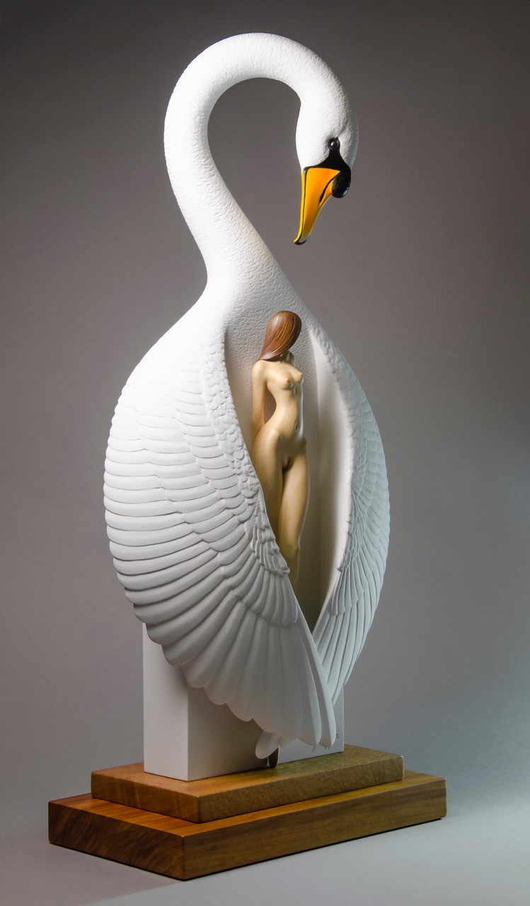Often, prosthetic limbs and super-accentuated body part proportions tie the pieces together, bringing to mind the surreal imagery of anime and the comic strip depictions of superheroes and heroines. He skilfully uses leather, brass, and stainless steel to provide stark contrasts with the warm texture of the wood.