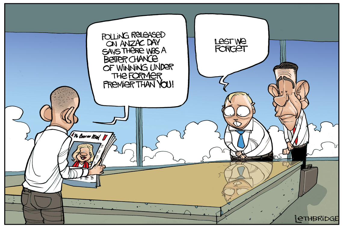 Published in the Political Cartoon column of the Courier Mail. Drawn and signed by cartoonist Brett Lethbridge.