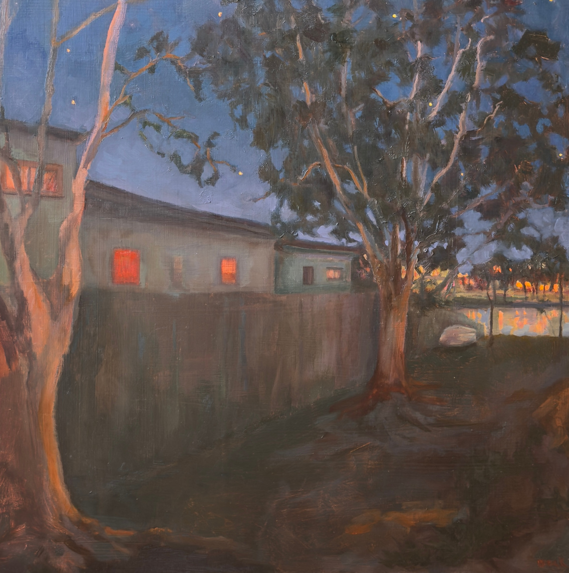 Karen Brock’s nocturne paintings draw from regular evening walks where she pauses to observe shifting light and atmosphere. As day transitions into night, the warmth of interior lights, quiet laneways and waterside reflections signal the rhythm of returning home. Her work reflects on memory, place and the gentle slowing of time within familiar spaces.