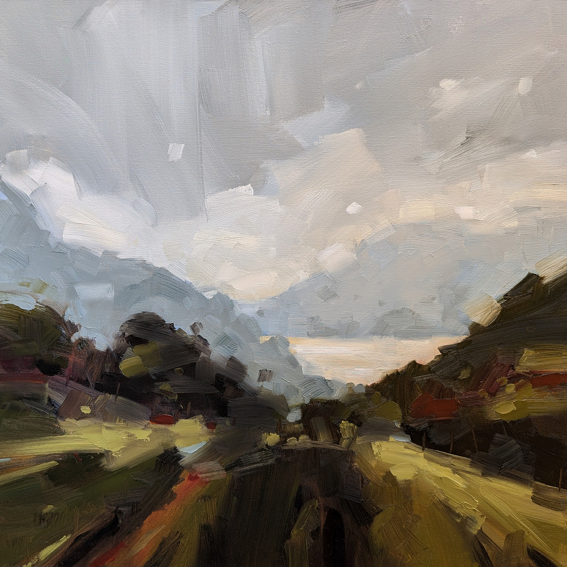 Based on pencil and oil sketches created in situ, from photographs, and from his recollection of locations, Matt’s dynamic representations of place arise from a synthesis of memory and sense impressions. Considered observation of the shape of the landscape, the movement of clouds, the perception of distance and the shifting of light inform Matt’s thickly textured approach, allowing him to move between representational and abstract responses to places.