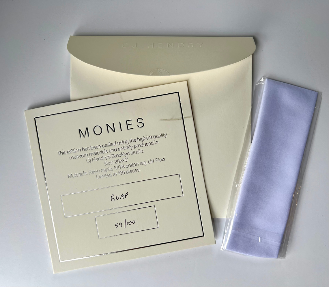 Limited edition patch from CJ Hendry's 2020 'Monies' series. Framed in a natural maple wood, deep shadow box frame behind UV resistant acrylic. Includes original packaging, authenticity card and a microfiber cloth.