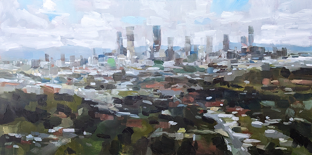 Based on pencil and oil sketches created in situ, from photographs, and from his recollection of locations, Matt’s dynamic representations of place arise from a synthesis of memory and sense impressions. Considered observation of the shape of the landscape, the movement of clouds, the perception of distance and the shifting of light inform Matt’s thickly textured approach, allowing him to move between representational and abstract responses to places.