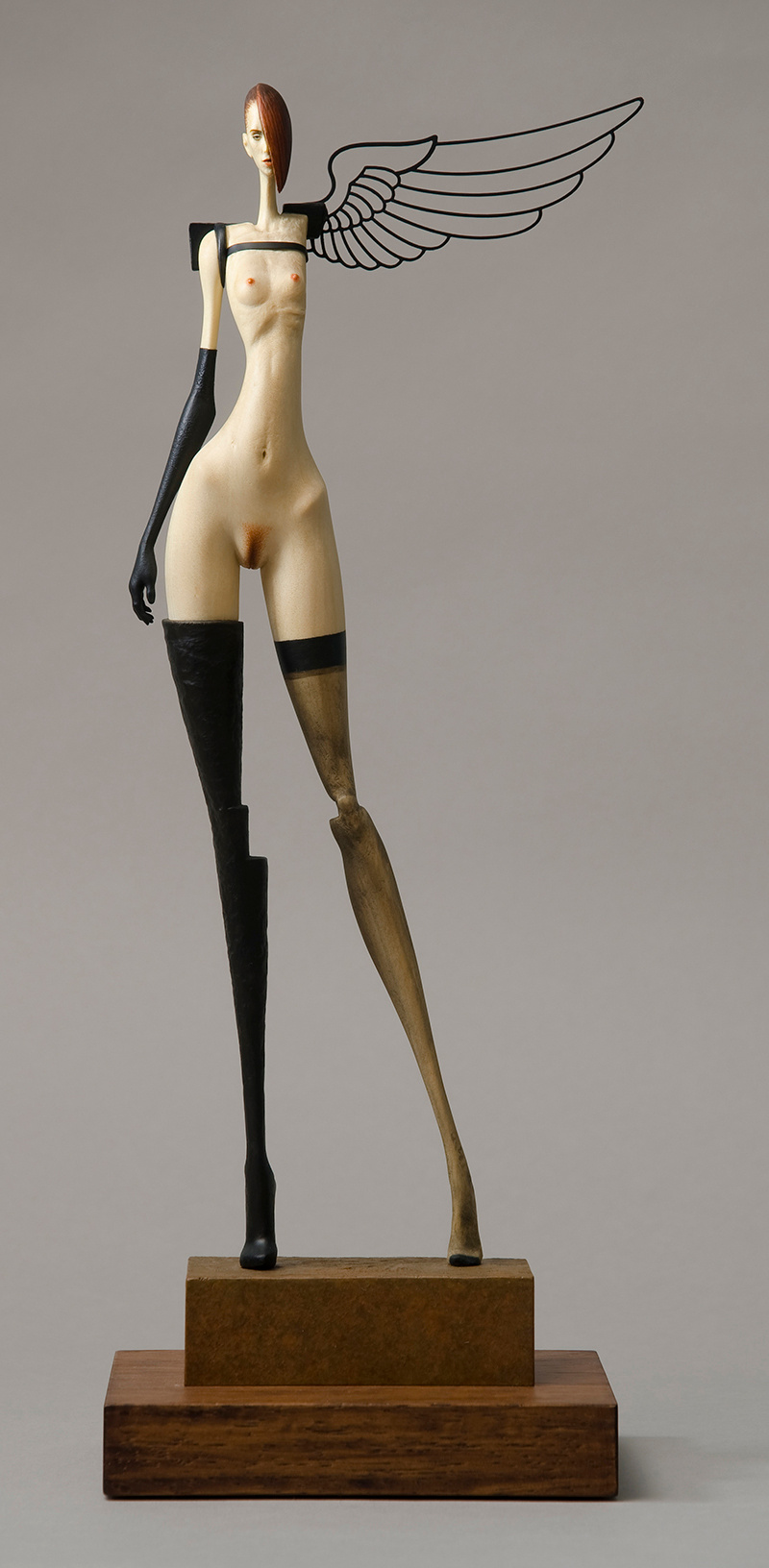 Often, prosthetic limbs and super-accentuated body part proportions tie the pieces together, bringing to mind the surreal imagery of anime and the comic strip depictions of superheroes and heroines. He skilfully uses leather, brass, and stainless steel to provide stark contrasts with the warm texture of the wood.