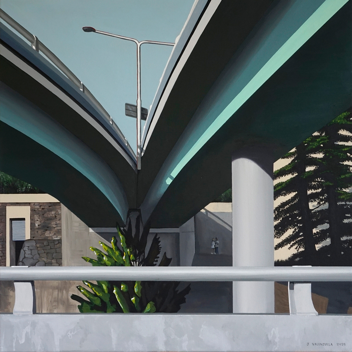 Brisbane artist J Valenzuela Didi draws on the emergence of patterns and geometric shapes to explore common scenes and signposts of modern life.  In his paintings, familiar urban landscapes become haunting and alien reminders of the beauty and character of the present-day.