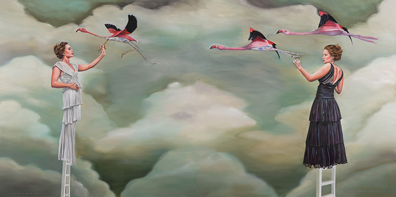 Tara has a beautiful gift for immersing the viewer into a world of Allegorical Surrealism. Her paintings engage us with their dainty tea cups - a symbol of the artists own for “taking time to connect with friends and to be kind to oneself” along with many other Allegorical Symbolism of the artists, such as feathers, top hats, nests and trees.