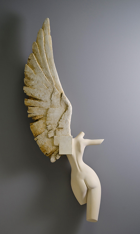 Often, prosthetic limbs and super-accentuated body part proportions tie the pieces together, bringing to mind the surreal imagery of anime and the comic strip depictions of superheroes and heroines. He skilfully uses leather, brass, and stainless steel to provide stark contrasts with the warm texture of the wood.